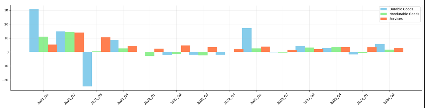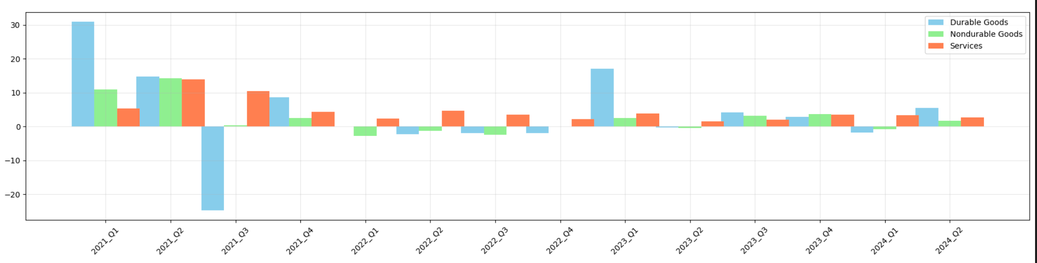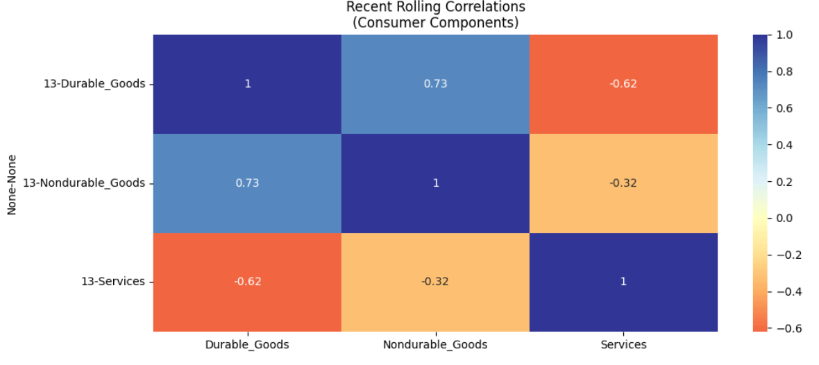 The "Rolling Correlation Evolution" and "Consumer Spending Components Comparison" charts provide visual representations of the shifting relationships between spending on durable goods, nondurable goods, and services. For instance, during economic uncertainty, consumers may delay purchases of durable goods, focusing instead on essential nondurable goods and services. The surge in durable goods in 2021 can be attributed to government stimulus payments and the release of pent-up demand following lockdowns.