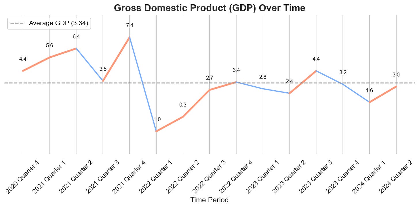 These fluctuations underscore the economy's sensitivity to external shocks, policy decisions, and global events. The sharp decline during the pandemic and the subsequent rebound highlight the importance of responsive fiscal and monetary policies in stabilizing the economy. In real-world terms, GDP growth directly affects employment, income levels, and living standards. Higher GDP growth typically leads to job creation, reducing unemployment rates and often resulting in wage growth and increased household incomes. Sustained GDP growth can improve access to goods and services, enhancing the overall quality of life. Conversely, periods of sluggish or negative GDP growth can lead to job losses, decreased consumer spending, and economic instability.