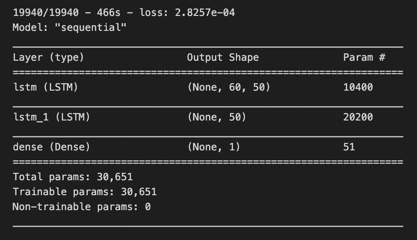 lstm_model.summary()This code snippet illustrates the development and training of a Long Short-Term Memory (LSTM) neural network model, utilizing Keras, which is integrated within the TensorFlow library. The primary objective of this code is to construct a model capable of recognizing patterns within sequential data, a functionality frequently applied in the domain of time series forecasting.