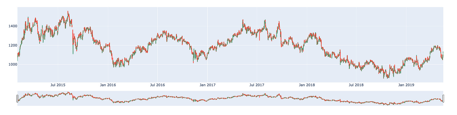 Subsequently, the code creates a figure via Plotlys go.Figure function. Within this figure, a candlestick trace is incorporated. This trace draws upon data from a DataFrame, referred to as df, which presumably contains historical price information related to the asset. The x-values signify time series, which likely consist of timestamps or dates extracted from the DataFrames index, while the corresponding columns provide the open, high, low, and close values required for the chart.