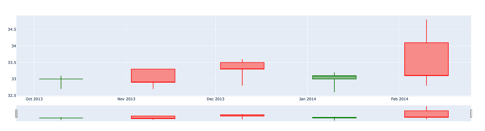 fig.show()This code is designed to generate a candlestick chart, which serves as a financial visualization tool to illustrate the price movements of a security over a defined time period. Specifically, this chart enables traders and analysts to clearly visualize the open, high, low, and close prices of various assets, such as stocks or cryptocurrencies.