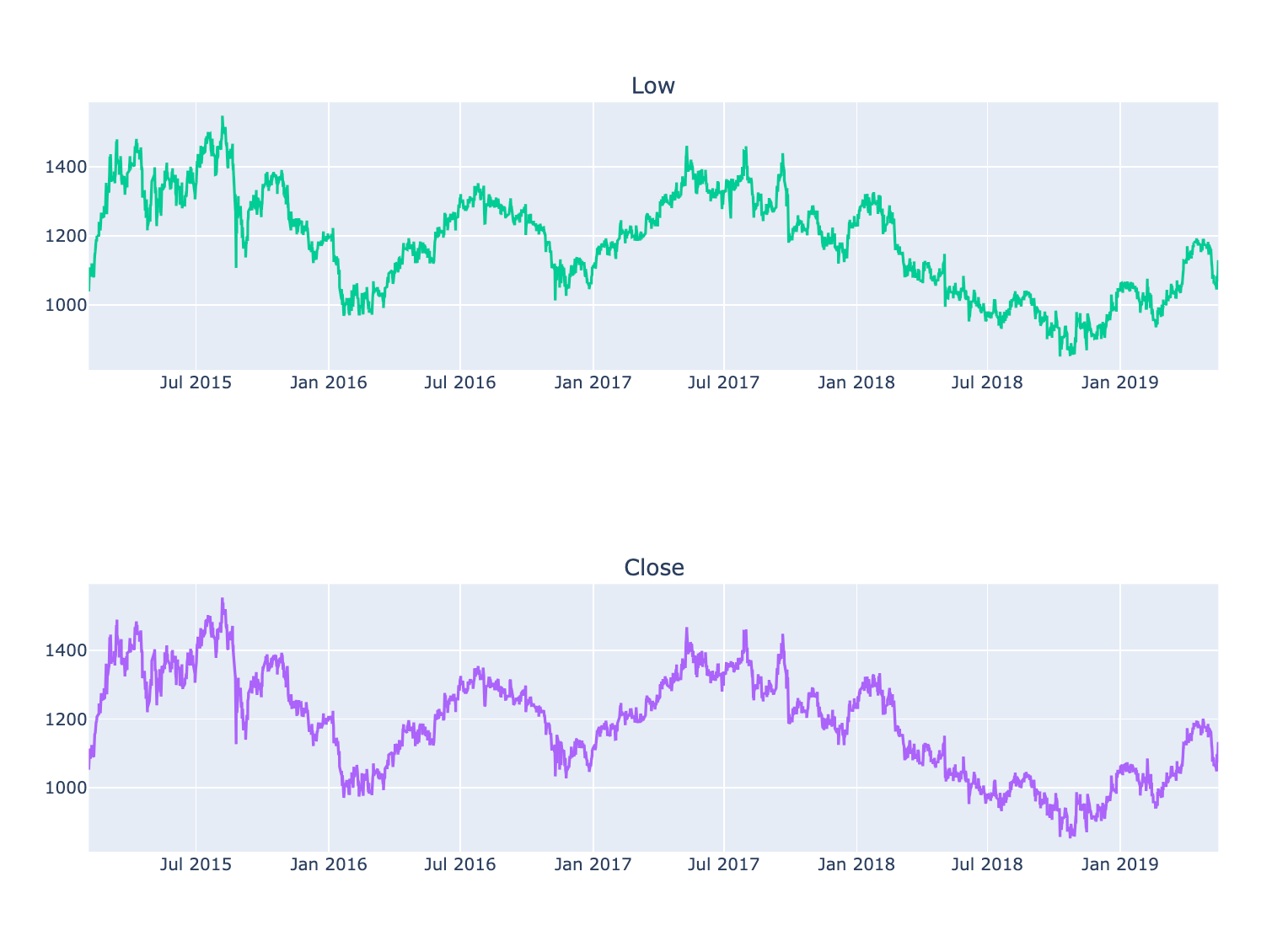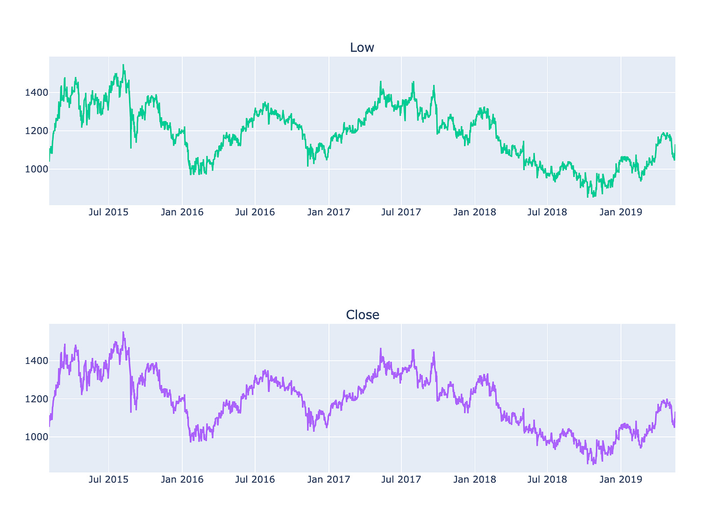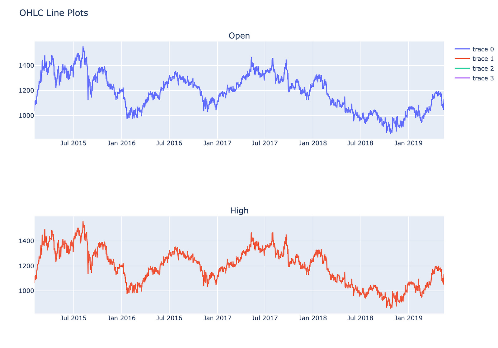 Subsequently, for each of the Open, High, Low, and Close prices, a line trace is incorporated into the appropriate subplot. The x-axis for each subplot derives from the index of a DataFrame, typically containing temporal data such as dates, while the y-axis indicates the various price metrics from the DataFrame.