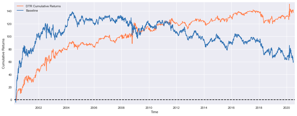 The plt.axhline(y=0, xmin=0, xmax=1, linestyle= — , color=k) line adds a horizontal dashed line at the y-axis origin (0% cumulative return), serving as a reference point to easily identify positive and negative returns.