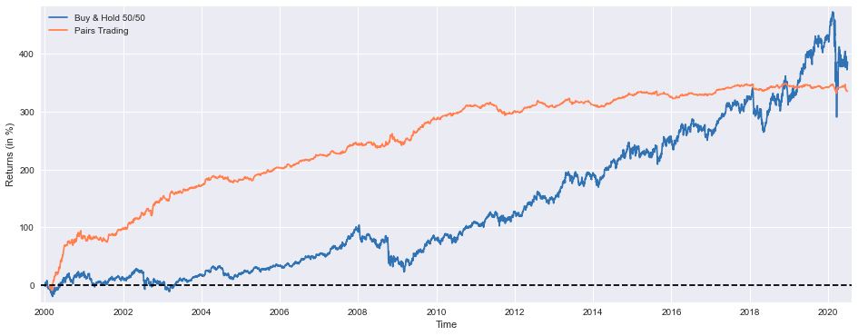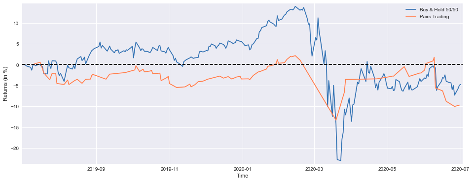 BuyHoldBoth = ((BuyHoldPEP+BuyHoldKO)/2).fillna(method='ffill')This code represents a comprehensive financial analysis system designed to evaluate the performance metrics of two prominent beverage sector securities: PepsiCo (PEP) and Coca-Cola (KO), alongside a composite benchmark incorporating both securities.