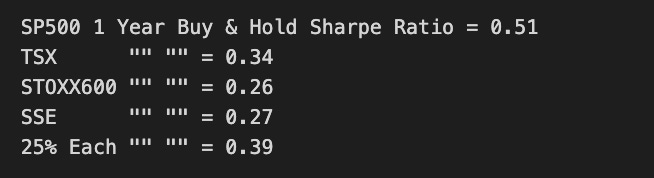 print('25% Each "" "" =',round(Each251YS,2))This code calculates the Sharpe ratios for various stock market indices over a one-year period. The Sharpe ratio is a measure of the risk-adjusted return of an investment, and it is calculated by dividing the excess return (the return above the risk-free rate) by the standard deviation of the returns.