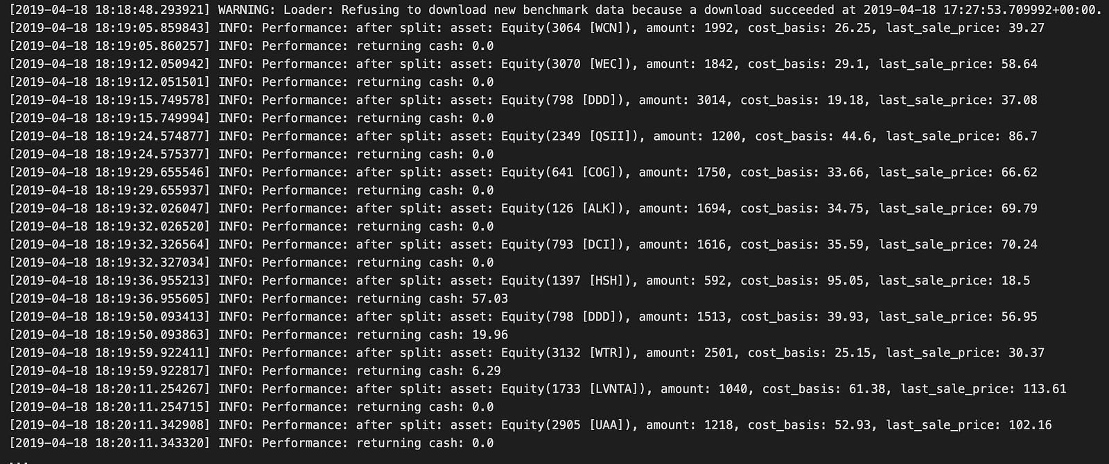 For example, Equity(3064 [WCN]) and Equity(3070 [WEC]) performance is documented along with their amounts and cost bases. During trading, the cash balance changes, reflecting trade results. Also, entries tell you how stocks performed after stock splits, which is important to figure out how they impacted portfolio value.