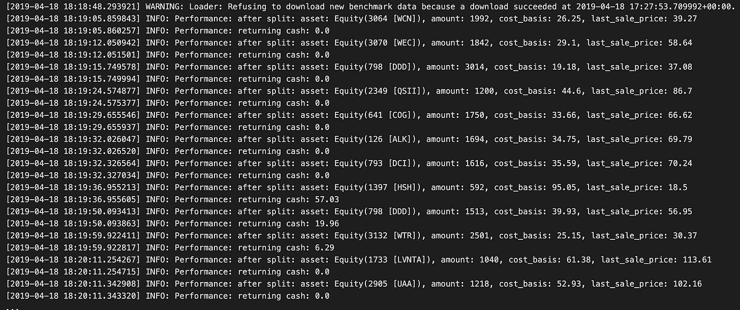 In the output log, you can see the backtest execution, starting with a warning about benchmark data not being available, but confirming that data had already been downloaded. Performance metrics are shown in the log entries marked INFO during the backtest. They show the amount, cost basis, and cash balance of various assets.