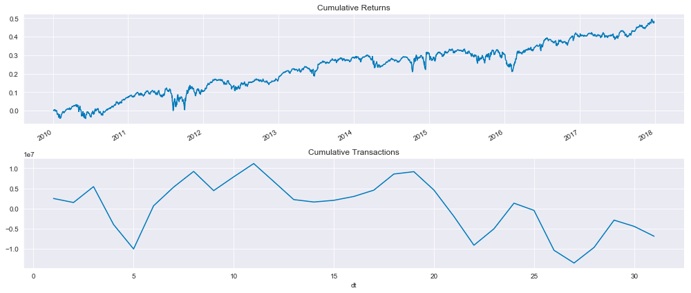 fig.tight_layout();This code snippet generates a figure with two subplots that visualize financial data from a mean reversion backtest using Zipline. The first subplot shows cumulative returns over time, while the second subplot shows cumulative transaction values over time.