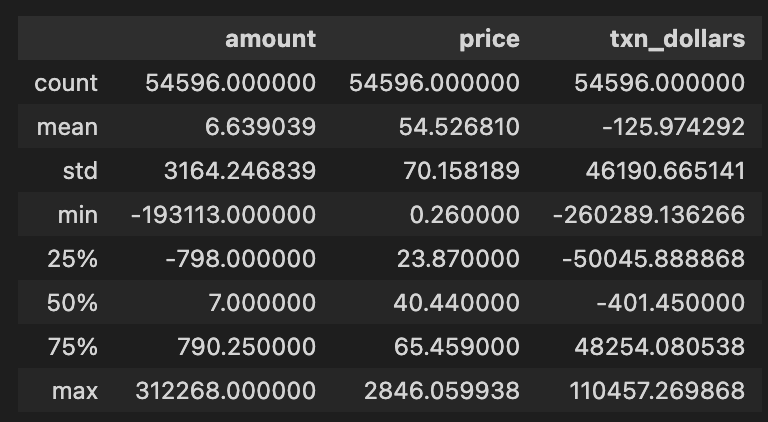 As you can see from the standard deviation values, the amount has a high standard deviation, 3164.43, indicating that it fluctuates a lot. -19,313 is the minimum transaction amount, indicating a lot of sell-offs or negative transactions, whereas 312,268 is the maximum, indicating a lot of transactions. In the quartiles, there’s a 25th percentile of amount at -798, meaning 25% of transactions are below that value, a median of 7 indicates half of transactions are below that amount, and a 75th percentile at 790.25, which means most transactions aren’t that big.