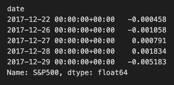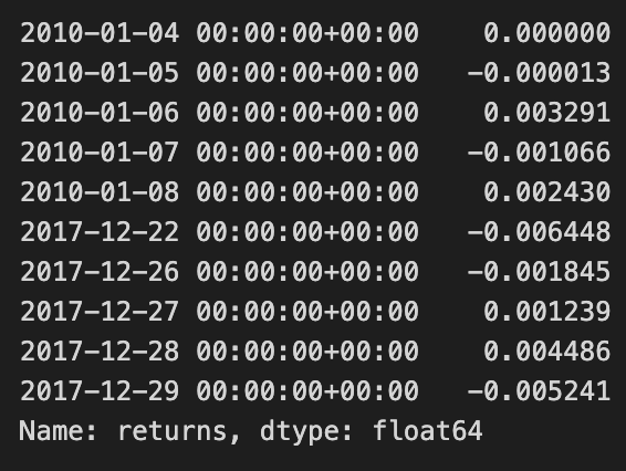 The output displays return values indexed by date from January 4, 2010, to December 29, 2017. The initial rows reflect returns for early January 2010, with values ranging from 0.000000 to -0.003291. The last entries from late 2017 present a mix of positive and negative returns, with the final value at -0.005241. This output illustrates the fluctuations in returns, providing insights into the asset’s performance at both the start and end of the observed period.