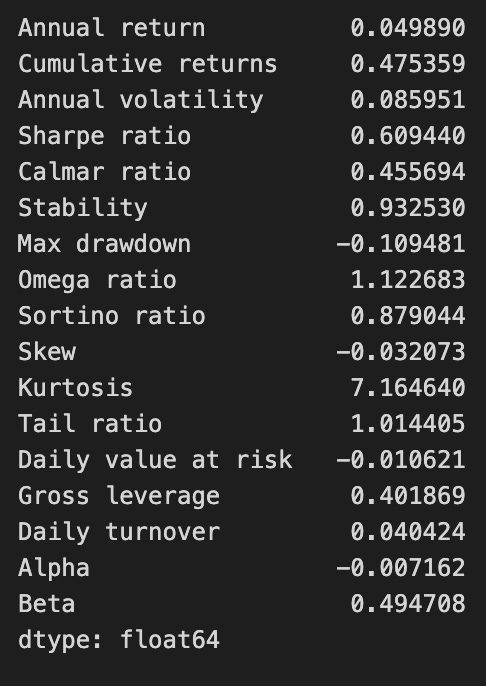 perf_stats(returns=returns, factor_returns=benchmark_rets, positions=positions, transactions=transactions)The function perf_stats evaluates the performance of a trading strategy by analyzing various financial metrics from the provided returns, benchmark returns, positions, and transactions. The output includes key performance indicators that assess the strategy’s effectiveness and risk profile.