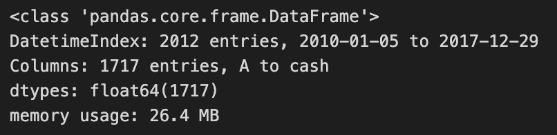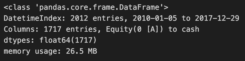 The code outputs a summary of the modified DataFrame, which is of type pandas.core.frame.DataFrame, containing 2,012 entries from January 5, 2010, to December 29, 2017. It includes 1,717 columns, featuring asset symbols and the new ‘cash’ column. All entries are of data type float64, suggesting they represent numerical monetary values. The DataFrame’s memory usage is 26.4 MB, indicating its resource consumption. This code effectively prepares the DataFrame for analysis or visualization by ensuring proper formatting of column names and the index.