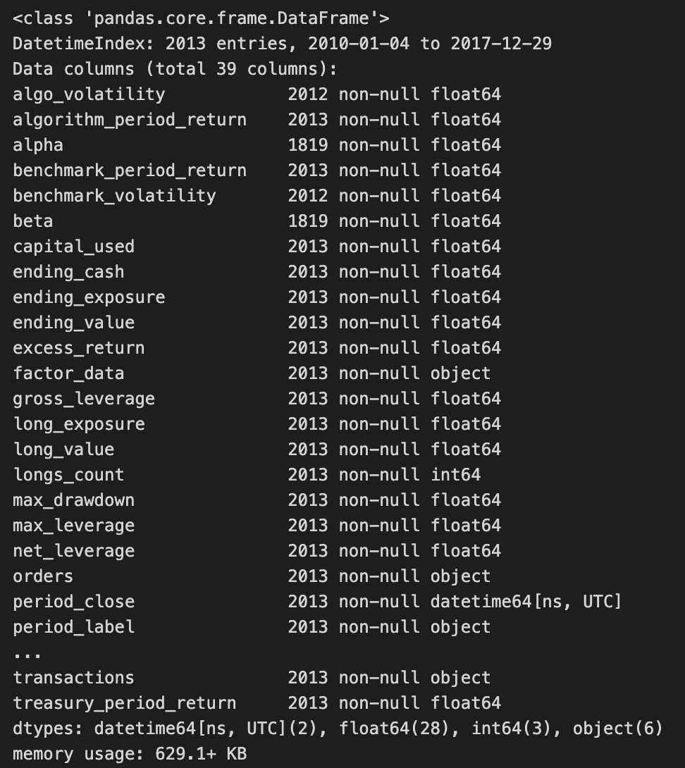 The output of the backtest.info() method summarizes the DataFrame’s structure, indicating a DatetimeIndex from January 4, 2010, to December 29, 2017, with 2013 entries. It includes 30 columns representing various metrics related to backtesting results, such as algorithm_period_return, alpha, benchmark_period_return, and excess_return, which are essential for assessing trading strategy performance.