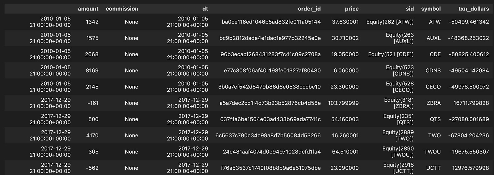 transactions.head().append(transactions.tail())The code snippet transactions.head().append(transactions.tail()) combines the first five and last five rows of a DataFrame named transactions. This operation allows for a quick examination of the beginning and end of the dataset, which can help identify trends or anomalies. The resulting DataFrame includes columns such as amount, commission, dt, order_id, price, sid, symbol, and txn_dollars, with data from January 5, 2010, to December 29, 2017. Each row represents a transaction, detailing the transaction amount, commission, date and time, order ID, price, and security symbol.