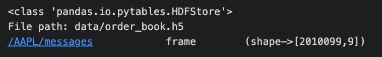 A pandas library is used to store stock-related messages in an HDF5 file. This function opens the HDF5 file order_book_store within the context manager so that it can be handled properly. With the stock identifier and the string messages, the code constructs a unique variable called key. A store.put() method is used to save the messages data in the HDF5 file. To verify that the data was successfully added and provide details about the data structure, the code prints information about HDF5 store contents.