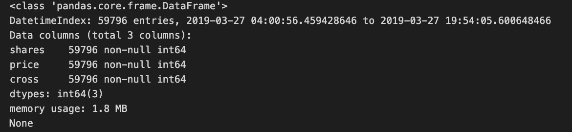 Then it removes rows without a price value, fills missing values with zeros, and sorts records chronologically by timestamp. All numeric values are then converted to integers and the trading data is returned.