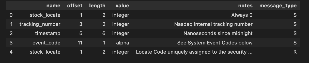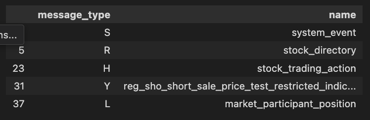 This function returns trading messages for a given stock. HDF5 stores records by stock identifiers. Messaging types are listed in the dictionary. The new column for message types identifies relevant trading messages by excluding stock_locate.