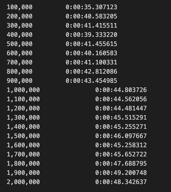 print('{:,.0f}\t\t{}'.format(i, timedelta(seconds=time() - start)))