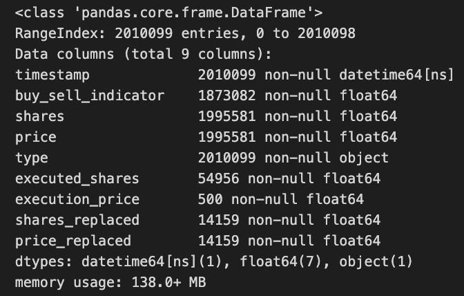 Using a DataFrame containing a type column, this function compiles trading records. It starts by mapping executed share and price column names. It selects and renames relevant columns based on message types: executions, cancellations, prices, and quotes. With pd.concat, these subsets are combined into one DataFrame.