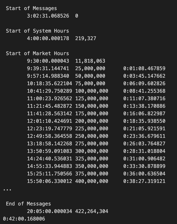 Processing begins with a timer to enable periodic progress updates. Code iterates through messages and reports the current count and processing time after every 100,000 messages, saves the order book’s state, and resets it for the next batch.