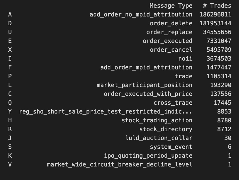 In addition to revealing market depth, the order book lists the number of bids and offers throughout the day. In order to assess liquidity and understand how large market orders will impact prices, this depth is crucial. Furthermore, the ITCH protocol includes information such as system events, stock characteristics, limit order placements and modifications, trade executions, and even the net order imbalance before markets open or close. Making informed trading decisions requires these insights.