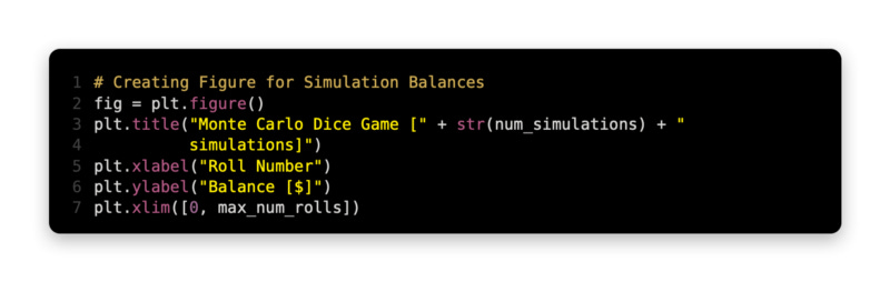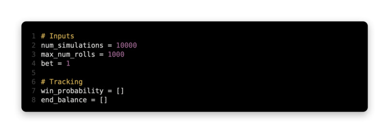 As the complexity of a project increases, the number of variables we can track also increases, so it’s important to determine what you want to track. Each simulation (or game) will be given a win probability (wins per game / total number of rolls) and an ending balance. Every game will update these lists, which are initialized as lists.