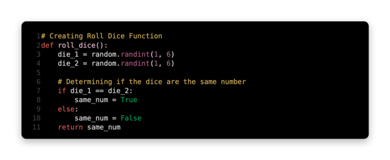Next, we can use a function to simulate a roll of both dice by randomizing an integer from 1 to 6. In addition to comparing the two dice, the function will also check if they are the same. Upon return, same_num will contain a Boolean value representing whether the rolls are the same or not. It will be used later to determine how to proceed with our code.