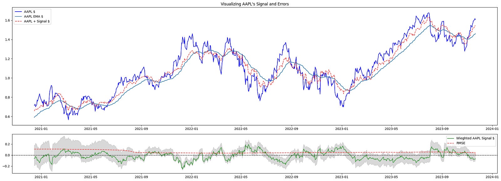 Finally, we visualize the trades executed alongside the signal and the acceptable error measures:
