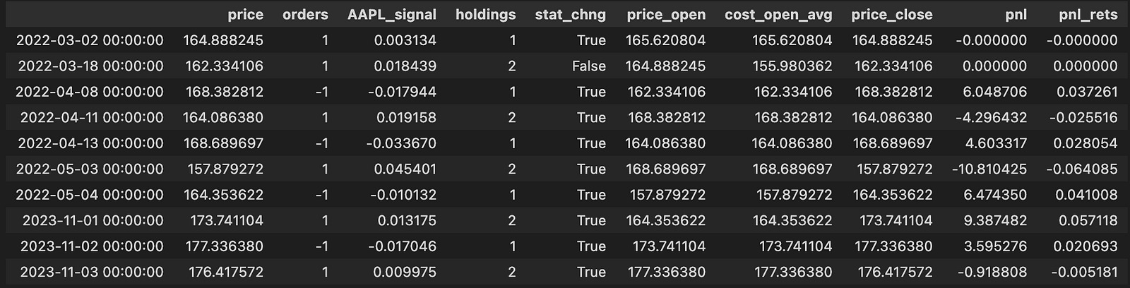 changes.tail(10)This block isolates the moments when we might change exposure and then computes realized PnL and holdings for those times. It begins by building a boolean mask (subset_mask) that marks rows where either the long or short entry condition is true; from the original arb_df we copy only the columns we need — price, orders, and the signal column — into a working DataFrame called changes so we operate on a focused subset without altering the source directly.