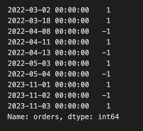 df.loc[df[”orders”] != 0, “orders”].tail(10)This block is building discrete trade entry signals for an arbitrage strategy by scanning a precomputed signal series and marking single-unit long or short orders when the signal crosses back through predefined thresholds while the model’s uncertainty is small. The top-level constants set the entry thresholds (long_thresh and short_thresh), the maximum allowed confidence-interval spread for acting (conf_spread_thresh), and the fixed trade size (max_qty). The ultimate goal is to populate an “orders” column on the arb_df DataFrame with +1 for a long entry, -1 for a short entry, or 0 for no action, so downstream execution or backtesting logic has simple, per-row discrete instructions.