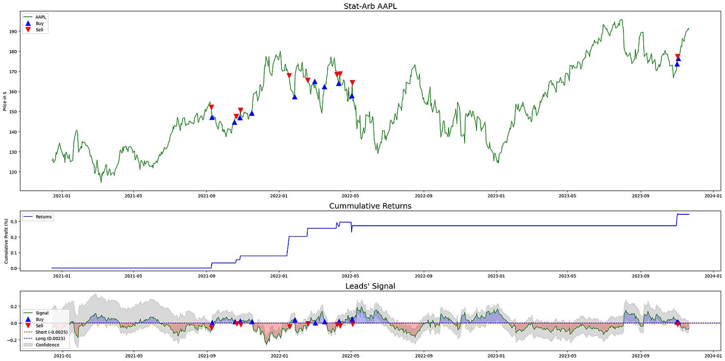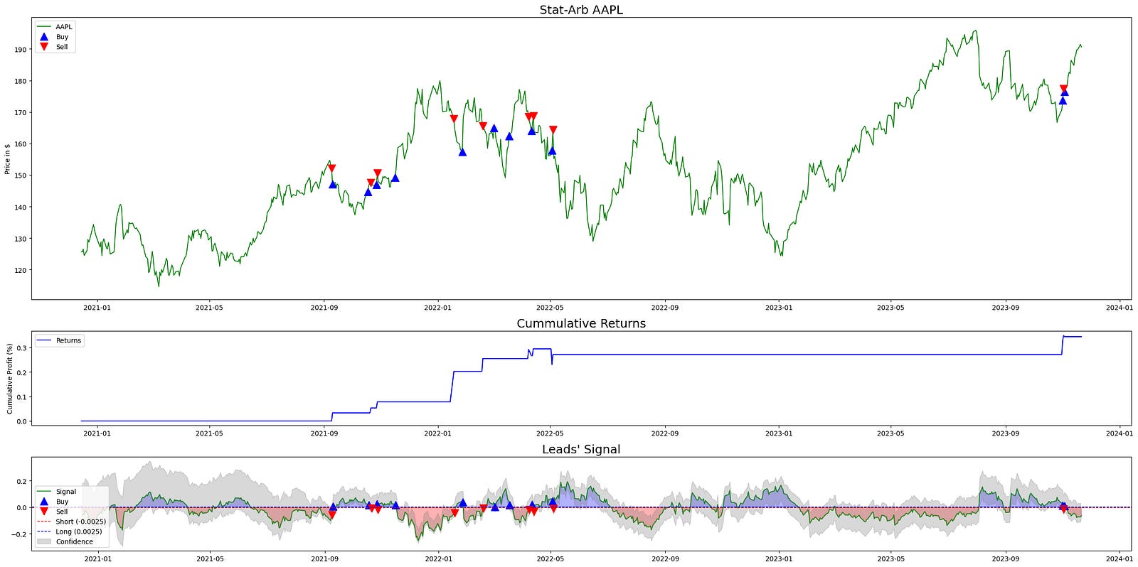 plt.show()This block builds a three-panel diagnostic chart to visualize how a statistical-arbitrage signal behaves, where trades occurred, and how those trades translated into cumulative profit. The overall goal is to give a compact, aligned view of price, strategy returns, and the driving signal (with its thresholds and confidence interval) so you can quickly assess signal quality and trading outcomes for the specified target asset in a quant-trading workflow.