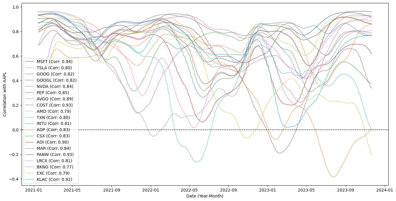 plt.show()The code is building a time-series visualization of how other tickers’ correlations with a base instrument (AAPL) evolve over time, and it also filters for tickers that are meaningfully correlated with that base. It starts by defining a few parameters: a base ticker symbol to compare against, a short smoothing window (SMOOTH_WINDOW) and a longer rolling window for the correlation calculation (ROLL_WINDOW = SMOOTH_WINDOW * 10). Those windows set the temporal scales used below: the longer ROLL_WINDOW determines the span used to compute a local Pearson correlation, while the shorter SMOOTH_WINDOW is used to smooth that sequence of local correlations so the plotted lines are less noisy and easier to interpret.