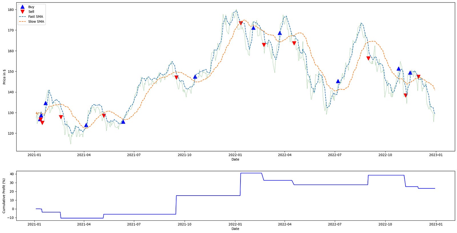plot_strategy takes the price series, the signal frame, and the computed profit series and produces two plotting axes (ax1, ax2). In practice ax1 is used to show the price path and trade markers or position overlays, and ax2 is used to visualize performance metrics such as cumulative returns or profit over time. Returning the axes rather than immediately showing the plot gives the caller the ability to augment those axes with additional lines or annotations; here the code uses that capability to overlay the two SMA lines onto the price axis for visual confirmation of the crossover logic.