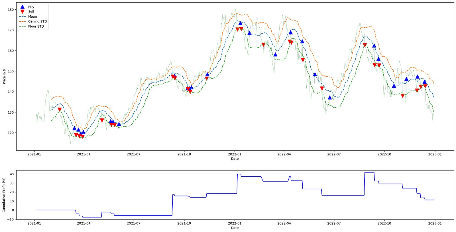 plt.show()This block begins by generating the trading signals that drive the rest of the pipeline: mean_reversion_signals(aapl_ts_df) consumes the time-series dataframe for AAPL and produces a signals structure indexed by time. That signals object contains the rolling mean and rolling standard deviation used by the strategy, and it also encodes the trade intent (e.g., long/flat/short or entry/exit markers) derived from comparing price to those statistics. We call this first so we have both the statistical thresholds and the discrete trading signals available for downstream profit calculation and visualization.
