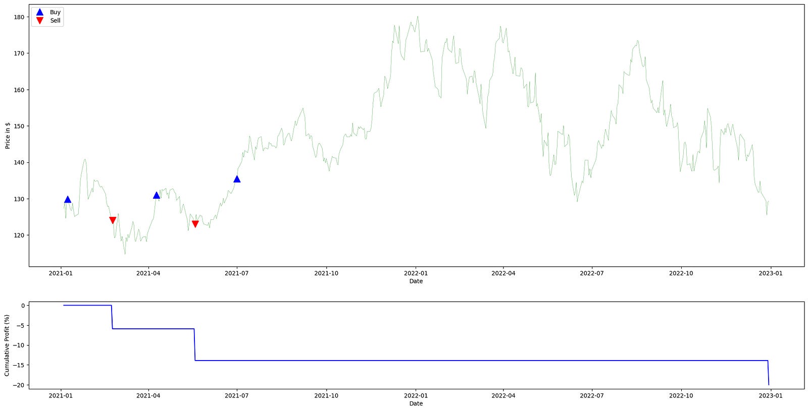 ax1, _ = plot_strategy(aapl_ts_df[”Adj Close”], signal_df, profit_series)