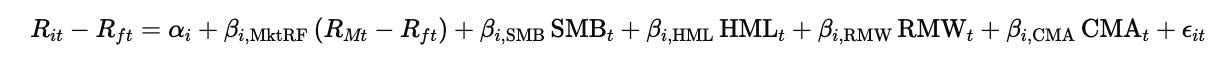 In this equation, Rit denotes the return on asset iii at time ttt, while Rft is the risk-free rate at the same time. The term RMt refers to the return on the market portfolio, and the expression RMt−Rft therefore represents the market risk premium, MktRF. The variables SMB, HML, RMW, and CMA correspond respectively to the size, value, profitability, and investment factor premiums at time ttt.