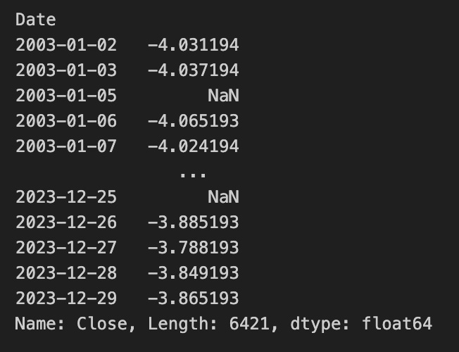 - Orders (events) derivation: to convert the time series of steady-state signals into discrete trading events, the code constructs a pandas Series from the signal array and takes a first difference. That difference highlights the timestamps where the signal changes: a transition from 0 to -1 produces a -1 in the diff (entering the negative-state), and a transition from -1 back to 0 produces a +1 (exiting the negative-state). The code then masks all zero differences to None so that only timestamps with an actual change in signal remain populated in the orders column; rows with no change become null entries rather than zeros. The first diff value will be NaN because there is no prior sample, and initial rolling windows produce NaNs for mean/std until there are enough observations, so early rows do not produce a -1 signal.