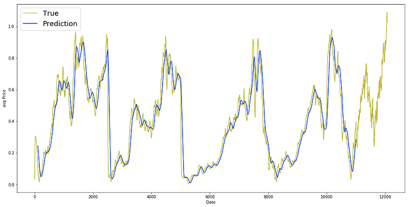 2. The line plt.plot(range(df.shape[0]), all_avg_data, color=’y’, label=’True’) showcases the true average prices (all_avg_data) in a yellow hue (‘y’), utilizing x-axis values obtained from range(df.shape[0]).