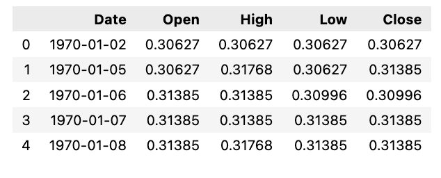 df = pd.read_csv(os.path.join(f'{googlepath}','ge.us.txt'),delimiter=',',usecols=['Date','Open','High','Low','Close'])The following script serves the purpose of importing a CSV file into a pandas DataFrame.