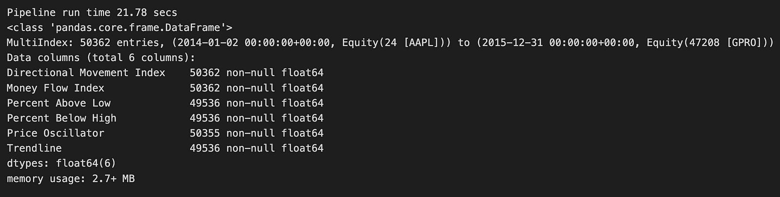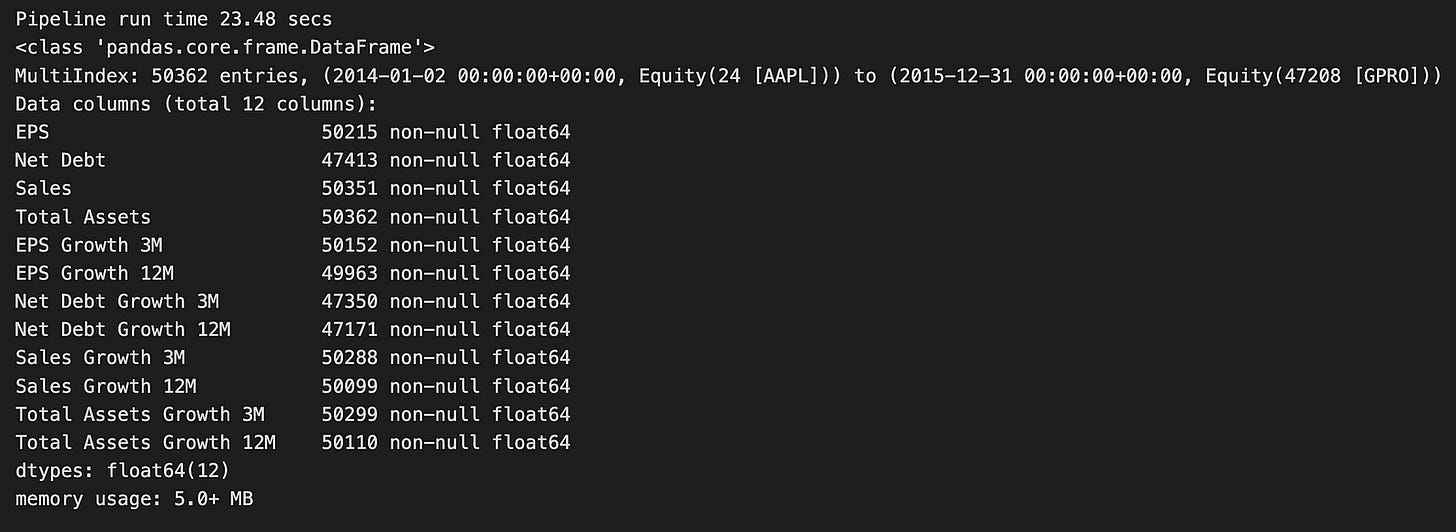 When the pipeline runs, it takes about 23.48 seconds to complete. It processes a large dataset containing 50,362 entries. The DataFrame uses a multi-index, meaning it organizes data by both time and specific financial instruments (like different stocks). There are 12 columns in the DataFrame, which include important financial metrics such as Earnings Per Share (EPS), Net Debt, and Sales. Each of these metrics also has additional columns showing their growth over three and twelve months.