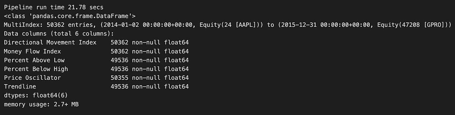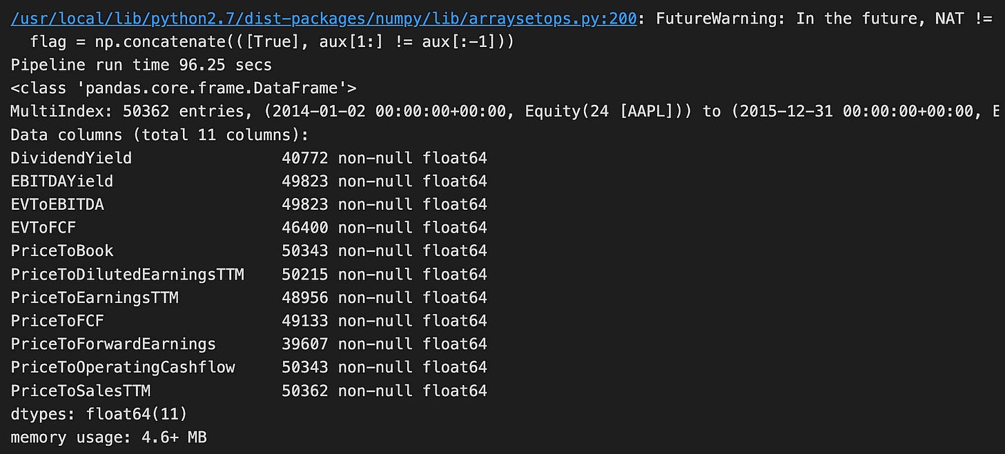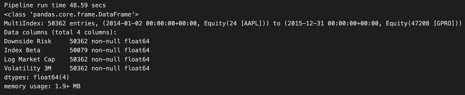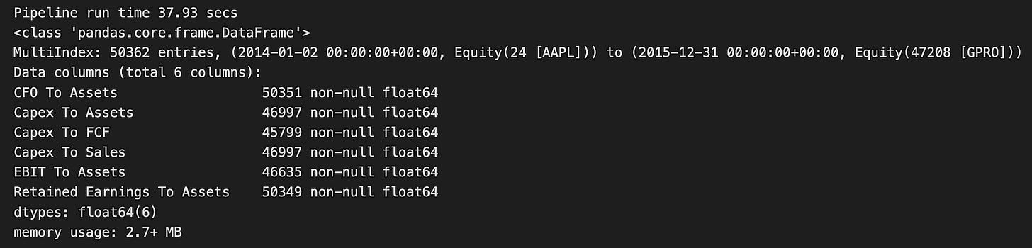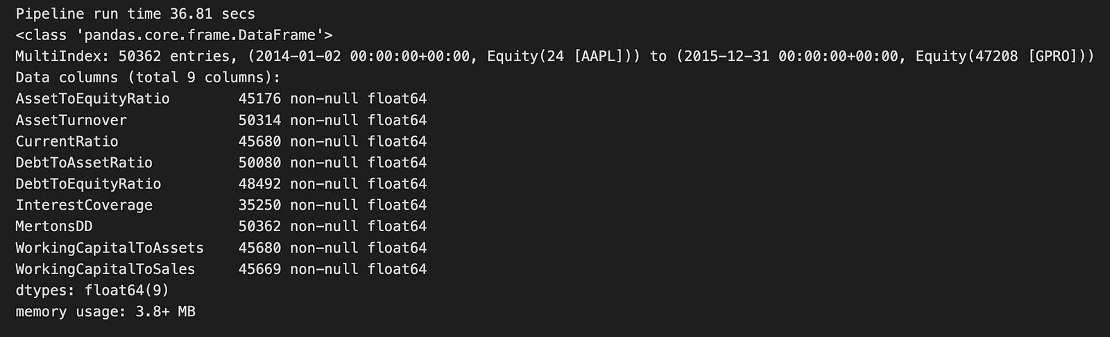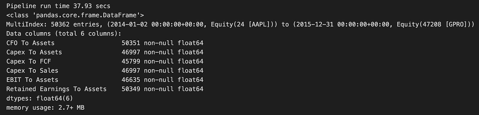 quality_result.info()The code runs a function called factor_pipeline, which handles various quality factors related to financial data. This function returns two things: quality_result, likely holding the processed data, and t, which measures how long the pipeline took to execute. After running, it prints out the runtime, showing that the pipeline completed in about 36.81 seconds.