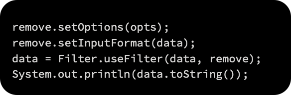 After that, we call the static method Filter.useFilter(Instances, Filter) to apply the filter to the selected dataset: