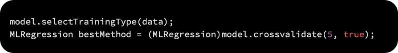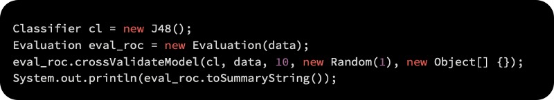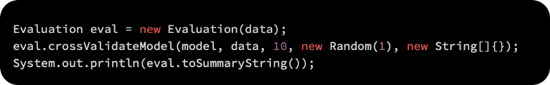For implementing cross-validation, Weka provides an Evaluation class. Here is how we pass the model, the data, the number of folds, and a random seed: