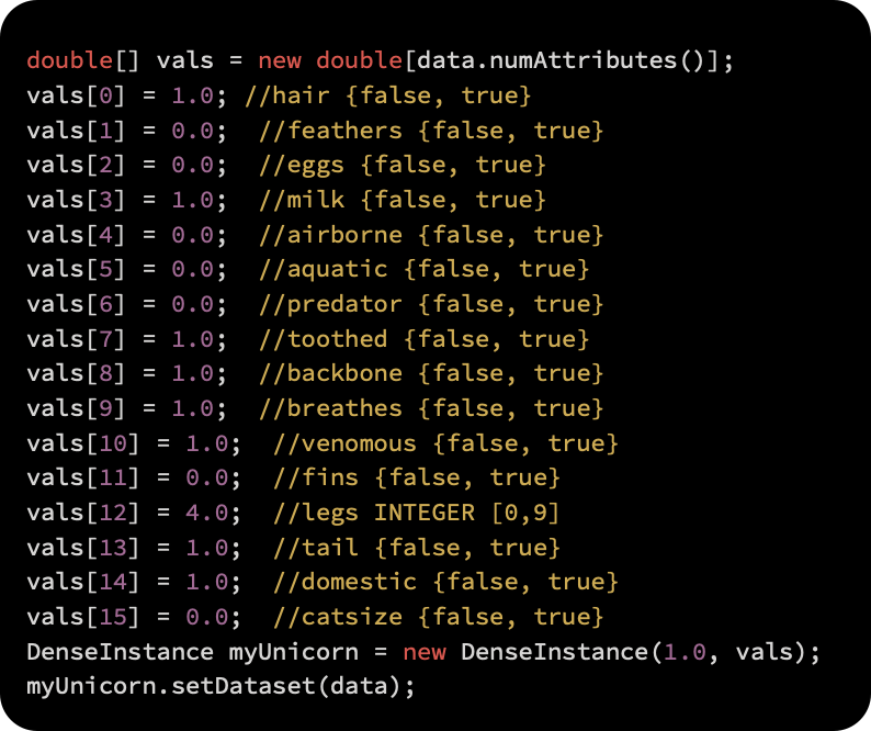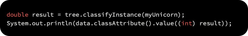 The model’s class value is obtained by calling classify(Instance). As a result of the method, the label index is returned as follows: