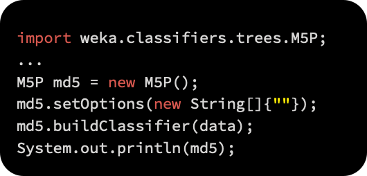 Within the M5 class, Weka implements a regression tree. As with any model, the method buildClassifier(Instances) should be invoked once the model has been initialized, the data and parameters passed, and the model’s parameters passed: