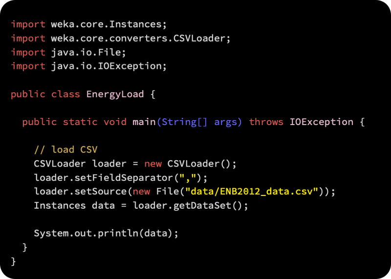 Now that the data has been loaded, we can begin working with it. The following code will demonstrate how to import CSV files using Weka’s converter for reading CSV files: