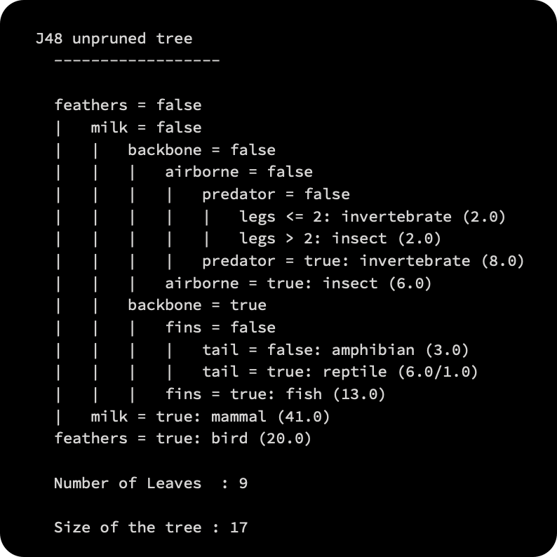 A tree object is now used to store the built model. To provide the unpruned J48 tree, we can use the toString() method: