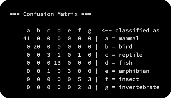 A classification node assigns labels to the columns in the first row. A true class value is then assigned to each additional row. The second row, for instance, corresponds to instances with the mammal true class label. As we can see in the column line, all mammals were correctly classified as mammals. Three of the reptiles in the fourth row were correctly classified as reptiles, while one was classified as fish and one as insect. It enables us to understand the types of errors that can be made by our classification model through the confusion matrix.