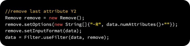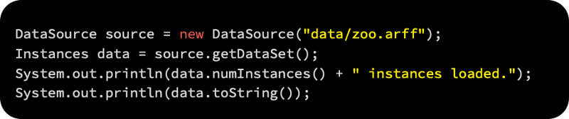 As a first step, Weka’s Attribute-Relation File Format (ARFF) is used to load the data and display the total number of loaded instances. A DataSource object contains each sample of data, while an Instances object contains the whole dataset, along with meta-information.