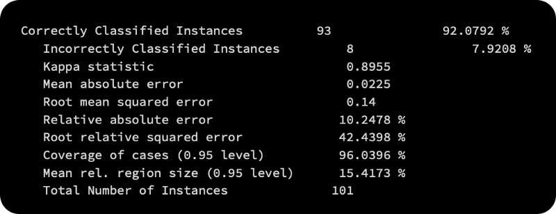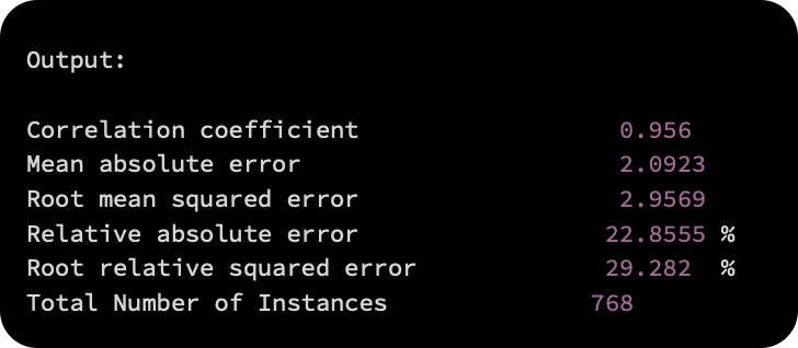 A number of common evaluation metrics, including correlation, mean absolute error, relative absolute error, etc., can be generated, as follows: